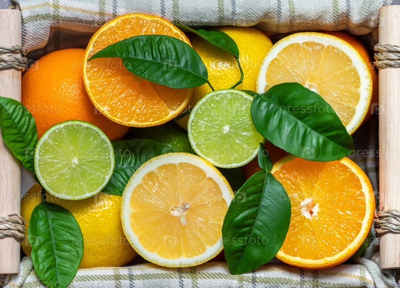 Нарезанный цитрус в корзине. Плоская укладка. Сочные спелые ломтики апельсина, лимона и лайма. Фруктовый микс, вид сверху