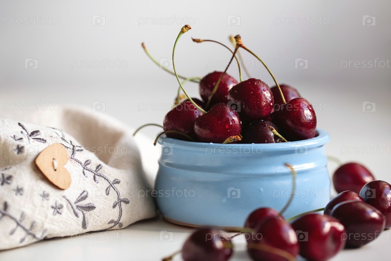 Красные вишни в каплях воды на белом фоне. Симпатичный натюрморт с вишнями в синем горшке и бежевой салфеткой с деревянным сердцем из пуговиц. Сочные свежие спелые ягоды вишни