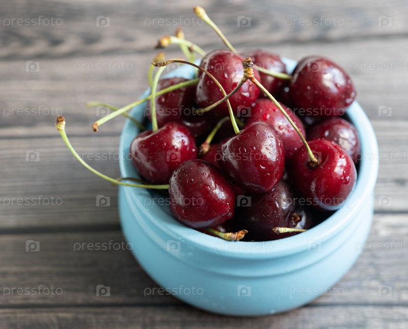 Спелые свежие вишни в синей миске. Продовольственный фон. Красная сочная вишневая ягода на сером фоне деревянных