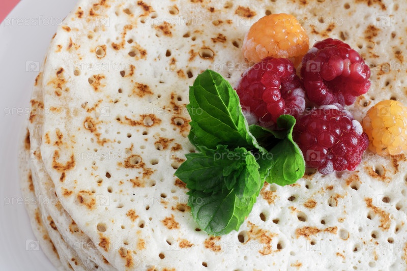 Жареные блины крупным планом на белой тарелке, блины с малиной, десерт на розовом фоне, место для текста, еда