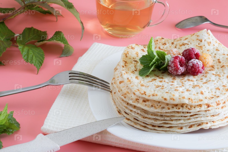 Жареные блины крупным планом на белой тарелке, блины с малиной, чайная церемония, десерт на розовом фоне