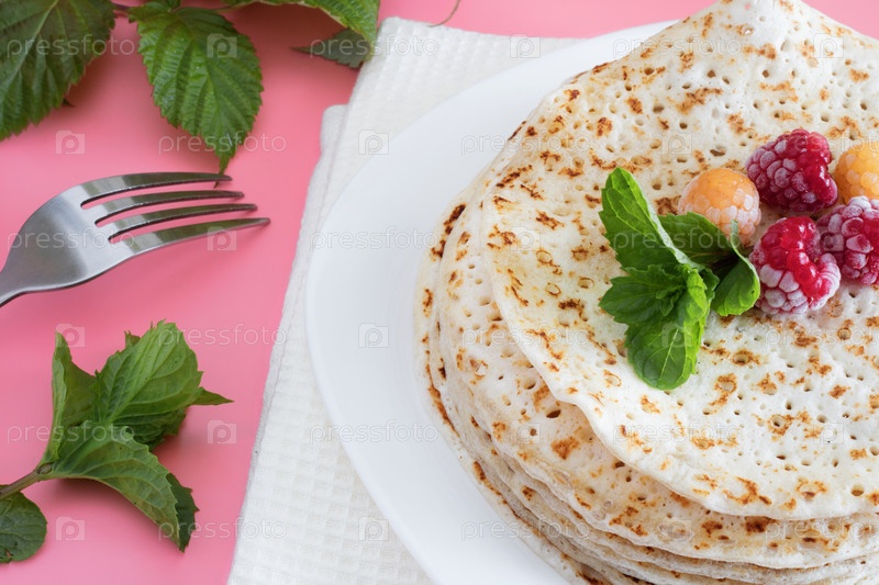 Жареные блины Жареные блины крупным планом на белой тарелке, блины с малиной, чайная церемония, десерт на розовом фоне, еда