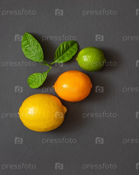 Концепция еды. Цитрусовые на каменном столе. Фруктовый фон. Плоская планировка, вид сверху. Лимон, цитрусовые мейери и лайм на темно-сером фоне