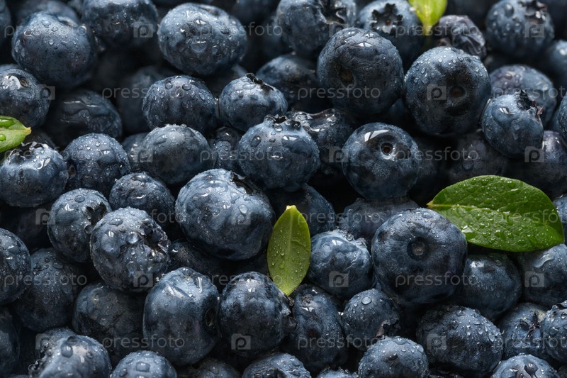 Ягодный фон. Свежая спелая черника с зелеными листьями крупным планом. Ягодные текстуры