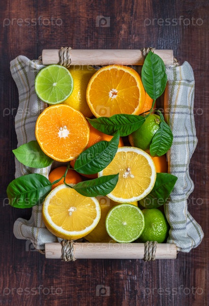 Нарезанные цитрусовые в корзине на деревянном столе. Плоская укладка. Сочные спелые ломтики апельсина, лимона и лайма на темно-коричневом фоне. Фруктовый микс, вид сверху