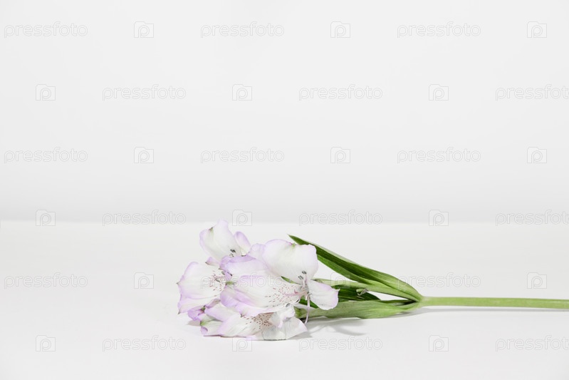 Букет белых сиреневых цветов альстромерии на белом столе, на сером фоне. Креативный вид цветов