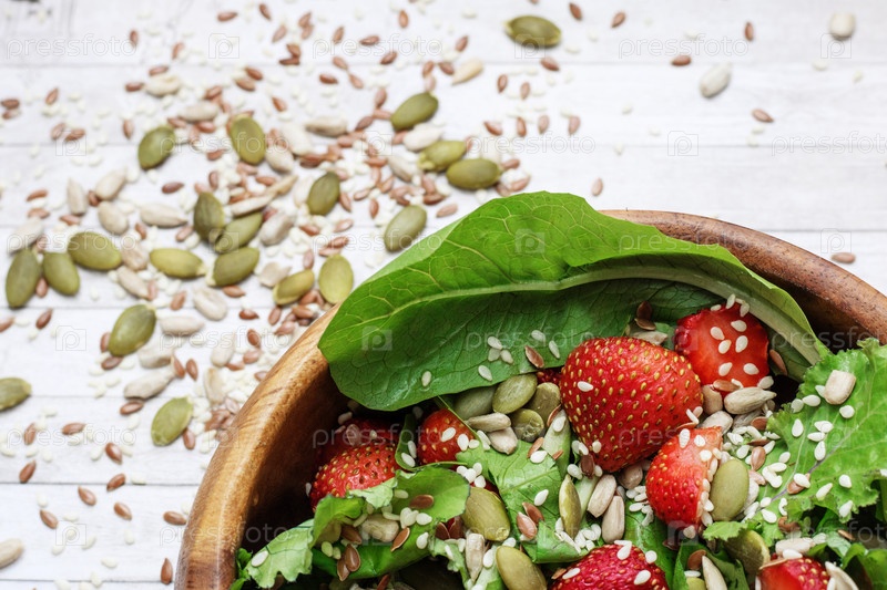 Диетический летний салат с клубникой, листьями салата и семечками, легкий перекус, здоровое питание