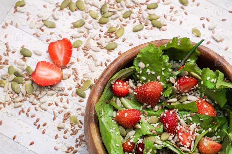 Диетический летний салат с клубникой, листьями салата и семечками, легкий перекус, здоровое питание