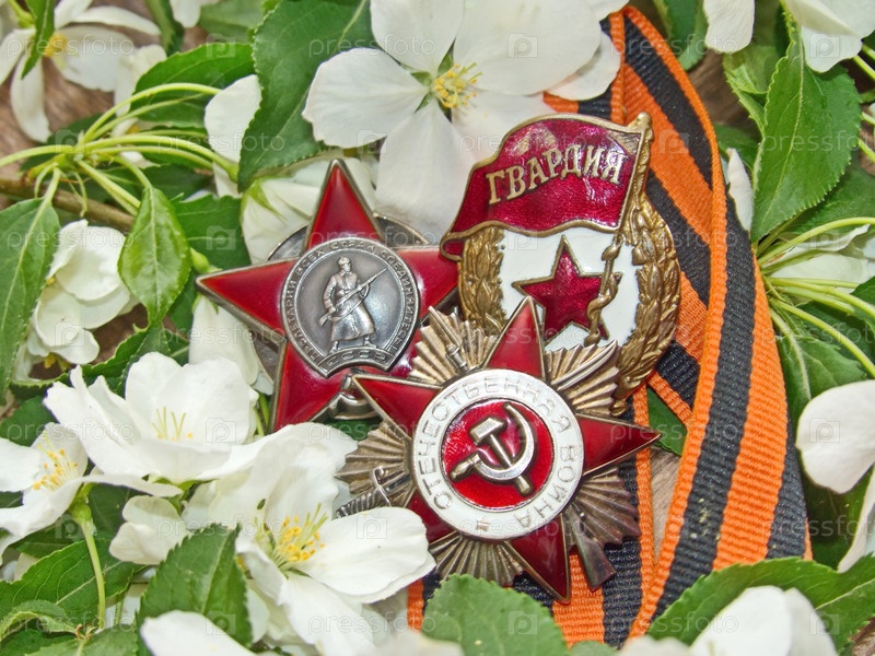 Ордена «Отечественной войны» и "Красной Звезды", знак «Гвардия» на на фоне георгиевской ленты и цветов яблони. Награды фронтовика. Семейная реликвия. Память. 9 мая День Победы