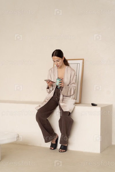 Молодая красивая женщина позирует в бежевой рубашке в студии, стоя у стены в коричневых брюках