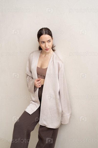 Молодая красивая женщина позирует в бежевой рубашке в студии, стоя у стены в коричневых брюках
