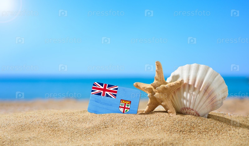 Тропический пляж с ракушками и флагом Фиджи. Концепция райского отдыха на пляжах Фиджи