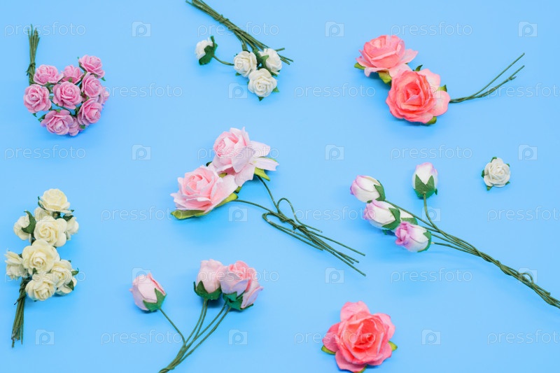 Фон небольшие букеты розовых цветов, цветочная композиция. вид сверху, плоская планировка