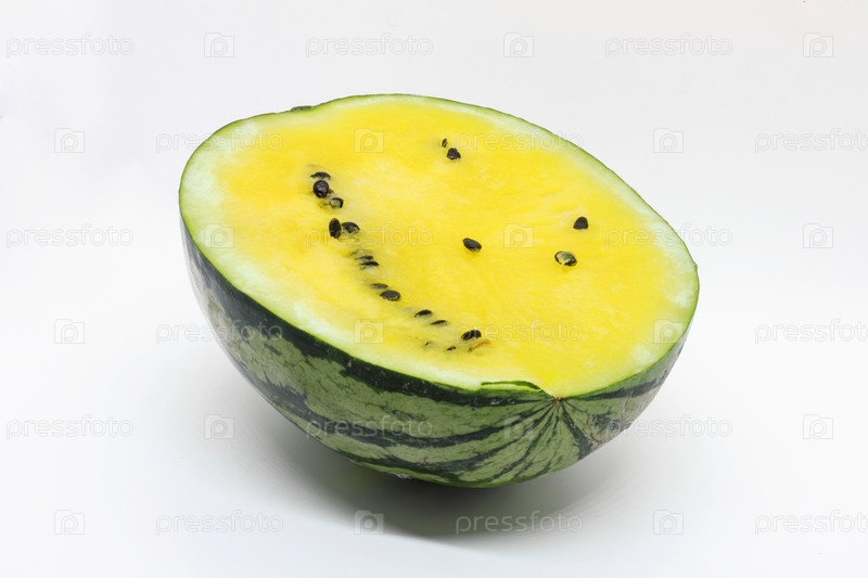 Крупный план освежающего арбуза на белом фоне, желтый арбуз, еда