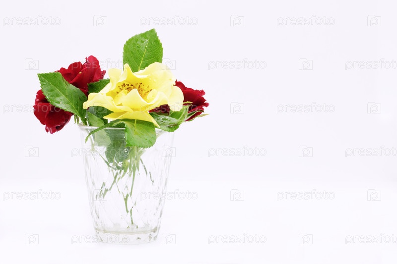 Цветок розы в стеклянной вазе, розы крупным планом на белом фоне стол в вазе, открытка к празднику, красивые цветы, место для текста