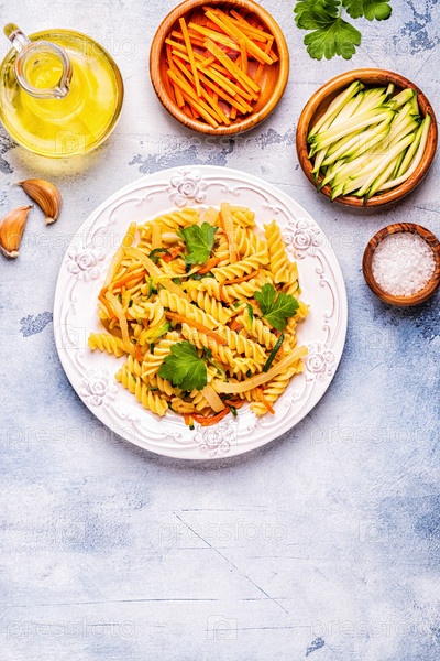 Паста фузилли с кальмарами, цукини и морковью