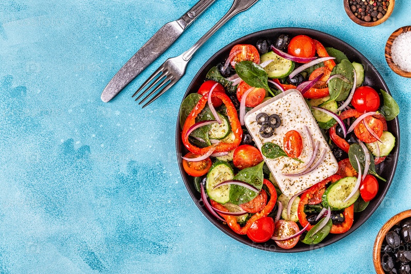 Греческий салат из свежих огурцов, помидоров, сладкого перца, шпината, красного лука, сыра фета и оливок