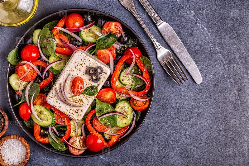 Греческий салат из свежих огурцов, помидоров, сладкого перца, шпината, красного лука, сыра фета и оливок