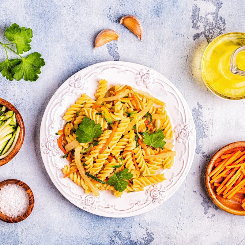 Паста фузилли с кальмарами, цукини и морковью