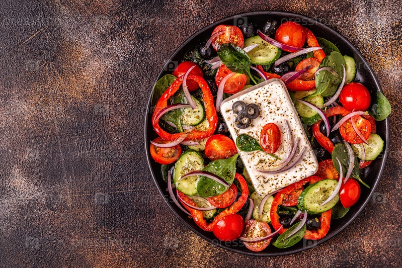 Греческий салат из свежих огурцов, помидоров, сладкого перца, шпината, красного лука, сыра фета и оливок