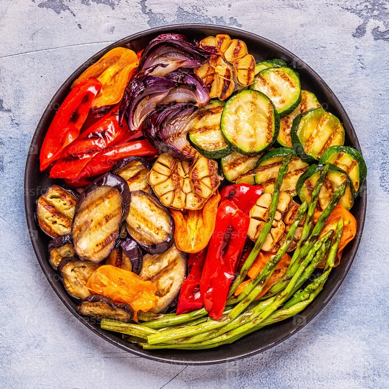 Жареные овощи на тарелке с соусом