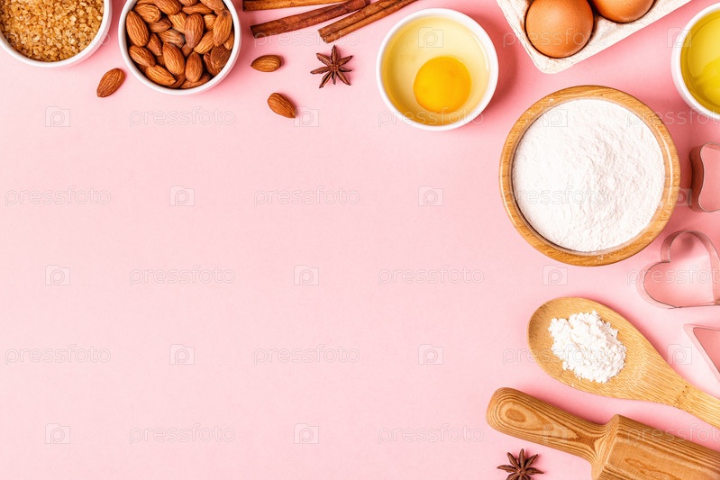 Ингредиенты и посуда для выпечки на пастельном фоне