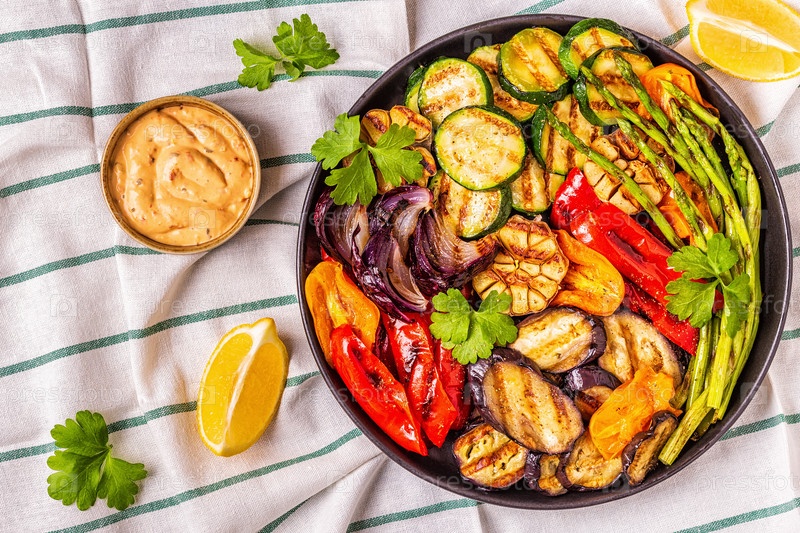 Жареные овощи на тарелке с соусом