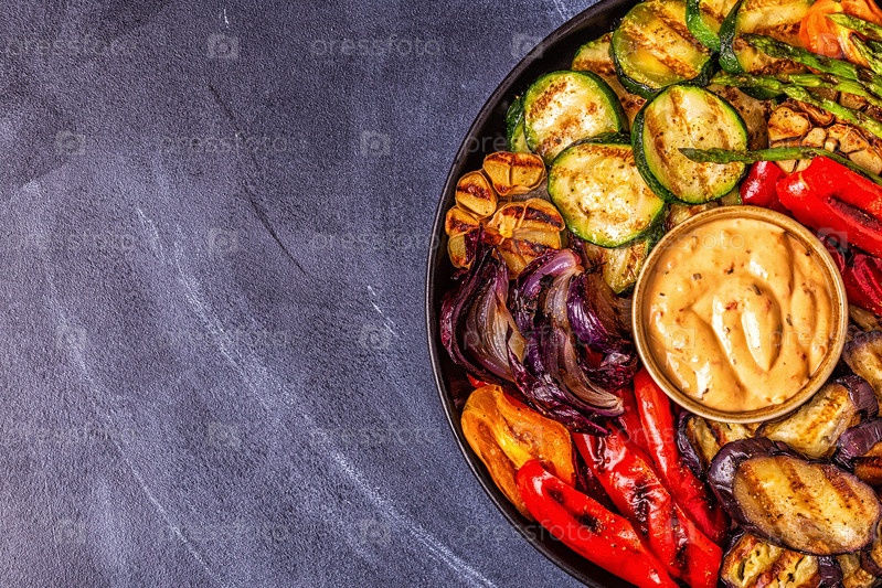 Жареные овощи на тарелке с соусом