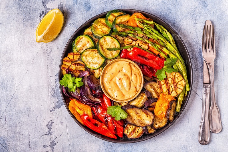 Жареные овощи на тарелке с соусом