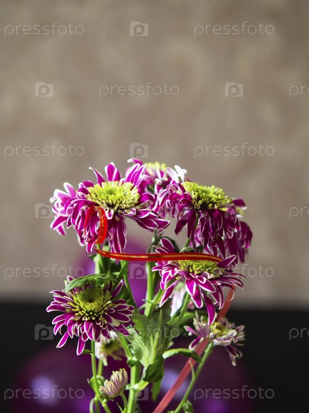 Ветка розово-зеленой хризантемы, перевязанная красной лентой на фоне воздушных шаров