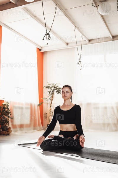 Привлекательная женщина в черной спортивной одежде занимается йогой, сидит на гимнастическом коврике в позе лотоса, занимается медитацией в студии