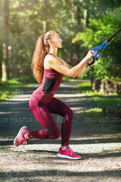 Молодая женщина приседает с фитнес-ремнями в парке