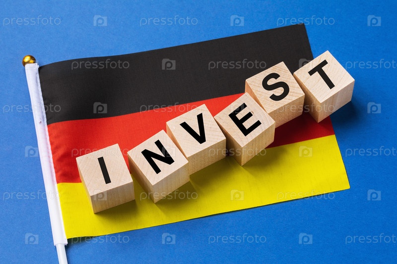 Деревянные кубики с текстом и флагом на цветном фоне, концепция инвестиций из Германии