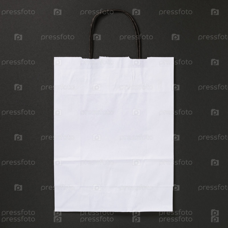 Белый бумажный пакет на черном фоне, вид сверху
