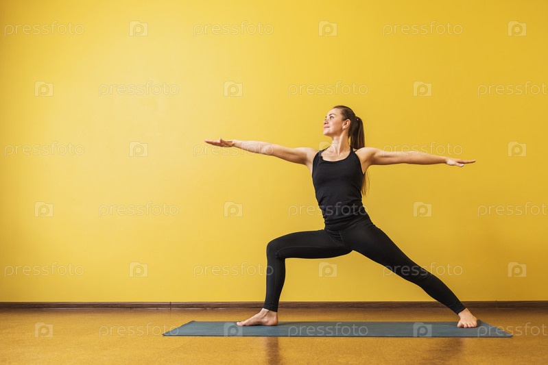 Привлекательная женщина в черной спортивной одежде, практикующая йогу, выполняет упражнение Вирабхадрасана, поза воина 2, у желтой стены с копией пространства