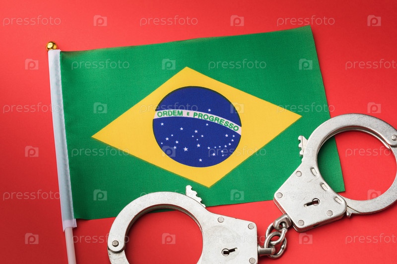 Флаг Бразилии и наручники на красном фоне, концепция преступности в стране