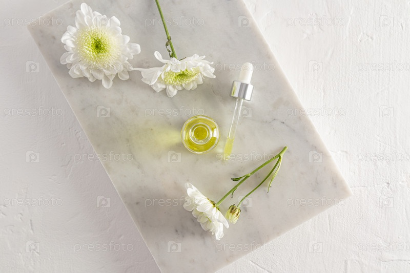 Вид сверху на открытую косметическую бутылку с сывороткой или маслом для ухода за лицом и телом. мраморный белый подиум и цветы. натуральная косметика