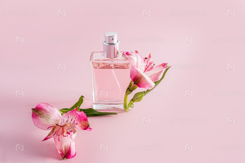 Флакон духов или косметический спрей на розовом фоне с цветами астромерии. концепция рекламы натурального аромата. пространство для копирования