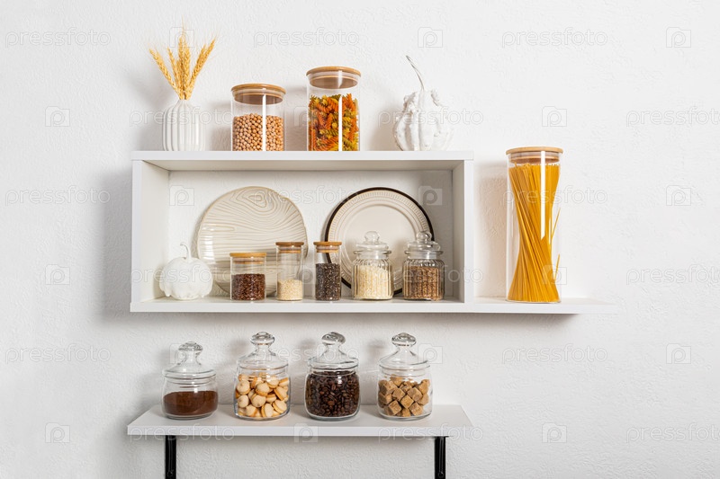 Набор стеклянной и керамической посуды, стеклянные банки с сыпучими продуктами на белых кухонных полках на текстурированной стене. компактное хранение. Стильный дизайн