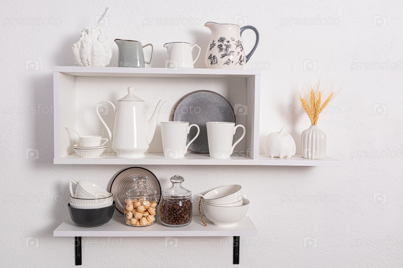 Красивые белые полки с кухонной утварью на белой текстурированной стене. интерьер кухни в белых тонах. передний план. экологически чистая кухня