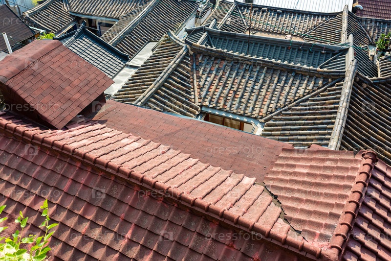Корейские традиционные крыши домов, вид сверху. Сеул, Южная Корея