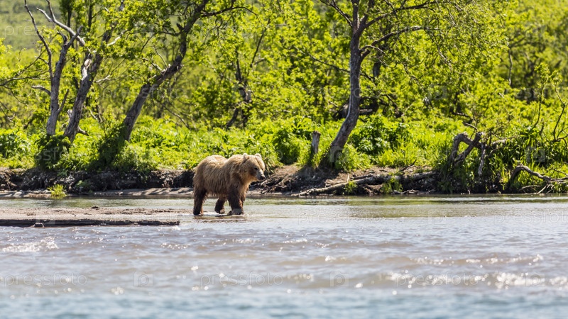 Бурый медведь или Ursus arctos beringianus ловит рыбу в Курильском озере.Камчатка, Россия