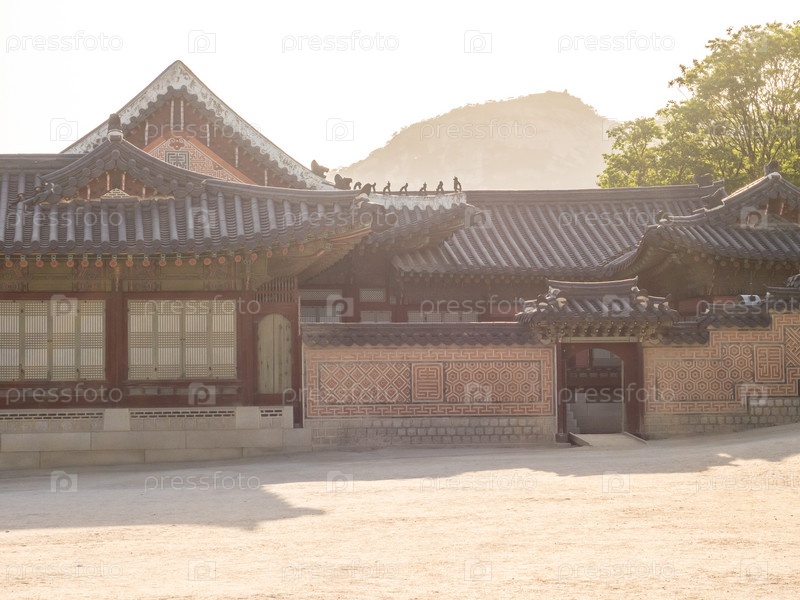 Фрагмент дворца Кенбоккун в лучах света. Сеул, Южная Корея, традиционная корейская архитектура