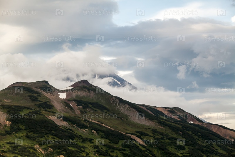 Вид на вулкан Вилючинский в пасмурную погоду, полуостров Камчатка, Россия