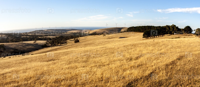Ветряные турбины стоят в ряд на лугу с видом на океан. Южная Австралия