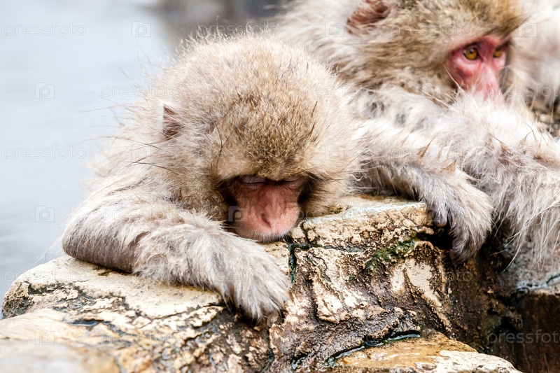 Милая японская снежная обезьяна сидит в горячем источнике, Япония