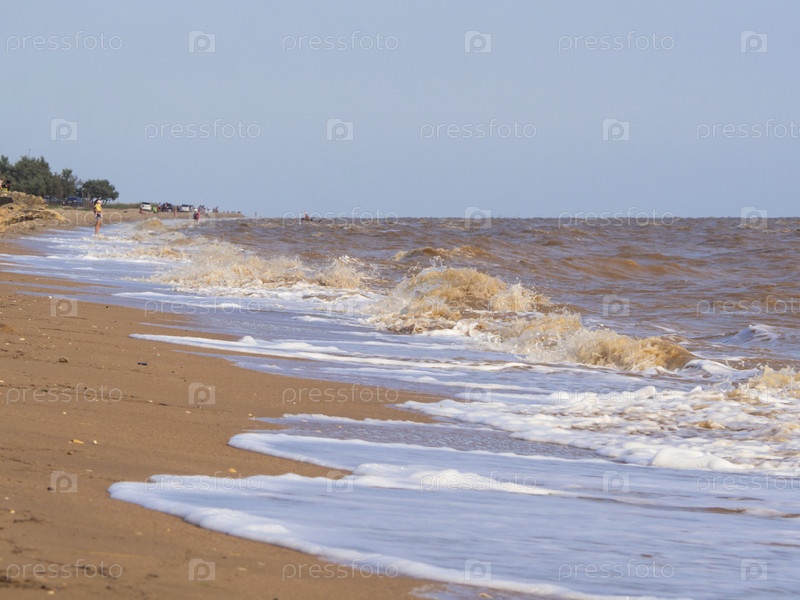 На берегу моря. Прибрежные пейзажи. Песчаная береговая линия пляжа на берегу моря с силуэтами людей на заднем плане. Красивый морской пейзаж курорта