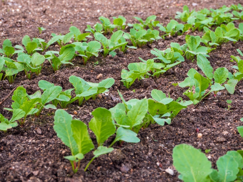 Молодые побеги редьки в саду. Весенняя рассада. Молодой редис на солнце. Ряды побегов овощных культур весной. Выращивание здоровой пищи. Эко овощи