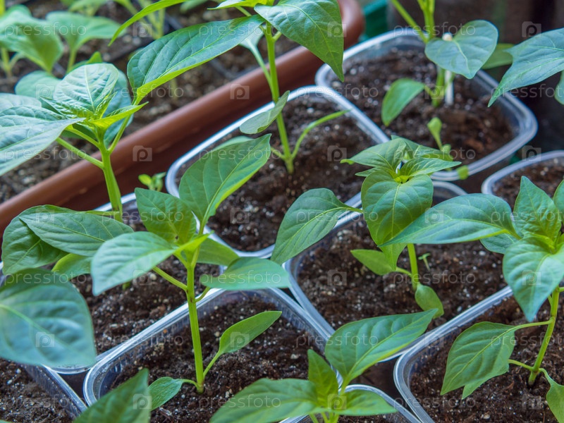 Рассада перца в пластиковых контейнерах, мягкий фокус. концепция органического овощеводства