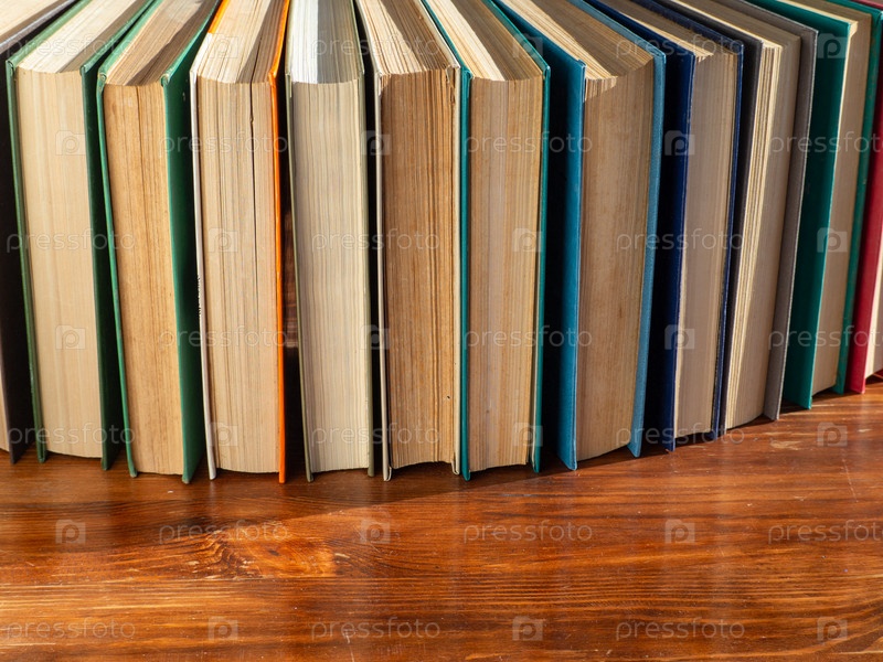 Книги в твердом переплете с пожелтевшими страницами на деревянном столе. Книги с красочными обложками стоят полукругом на темно-коричневой деревянной поверхности. Концепция обучения и образования